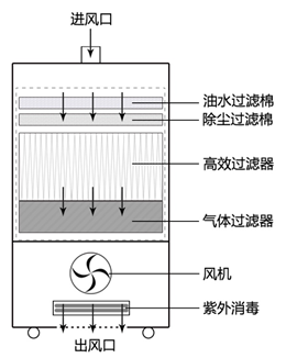 2.主過濾層過濾梯度設(shè)置:初中效過濾+HEPA高效過濾。凈化顆粒直
