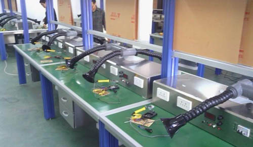 | 外排和室內凈化簡述: (1):外排方式: 整體布管根據實際情況使用不同的風機,通過分次布管接到各個焊錫工位,通常主管直徑在30CM左右,分到次管直徑為5CM到10CM之間,前面也需要加上喇叭口之類的吸煙罩以達到更好的吸煙效果,風機功率在7.5千瓦左右。一個7.5千瓦風機能帶上20個左右焊錫工位![煙霧凈化器] (2):通過煙霧凈化設備凈化后直接在室內排放: 采用煙霧凈化設備直接將煙霧廢氣完整的吸過來,經過凈化處理達室內空氣質量標準,可直接在室內排放。