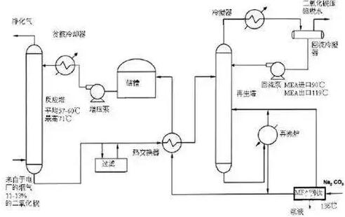 主要工藝原理: 工藝流程主要由三部分組成:以吸收塔為中心,輔以噴水冷卻及增壓設(shè)備;以再生塔和再沸器為中心,輔以酸氣冷凝器以及分離器和回流系統(tǒng);介于以上兩者之間的部分,主要有富酸氣吸收液、再生吸收液換熱及過(guò)濾系統(tǒng)。 從爐后經(jīng)除塵、脫硫后引來(lái)的煙氣溫度約為50℃,經(jīng)設(shè)置在CO2捕集裝置吸收塔前的旋流分離裝置將煙氣中的石膏液滴脫除并降塵,然后進(jìn)入煙氣冷卻器中與循環(huán)冷卻水換熱,使其溫度降到~40℃,達(dá)到MEA理想吸收溫度,通過(guò)氣水分離器除去游離水后經(jīng)增壓風(fēng)機(jī)加壓后直接進(jìn)入捕集裝置吸收塔進(jìn)行CO2吸收[煙霧凈化機(jī)]。 設(shè)置煙氣預(yù)處理系統(tǒng),脫除煙氣脫硫后攜帶的粉塵、水等雜質(zhì)對(duì)系統(tǒng)的長(zhǎng)期穩(wěn)定運(yùn)行有利,同時(shí)使用抗氧化劑和緩蝕劑,吸收劑消耗低,設(shè)備腐蝕小。增壓風(fēng)機(jī)用來(lái)克服氣體通過(guò)捕集裝置吸收塔時(shí)所產(chǎn)生的阻力。 在捕集裝置吸收塔中,煙氣自下向上流動(dòng),與從上部入塔吸收液形成逆流接觸,使CO2得到脫除,凈化后煙氣從塔頂排出。由于MEA具有較高的蒸汽壓,為減少M(fèi)EA蒸汽隨煙氣帶出而造成吸收液損失,通常將吸收塔分成兩段,下段進(jìn)行酸氣吸收,上段通過(guò)水洗,降低煙氣中的MEA蒸汽含量。